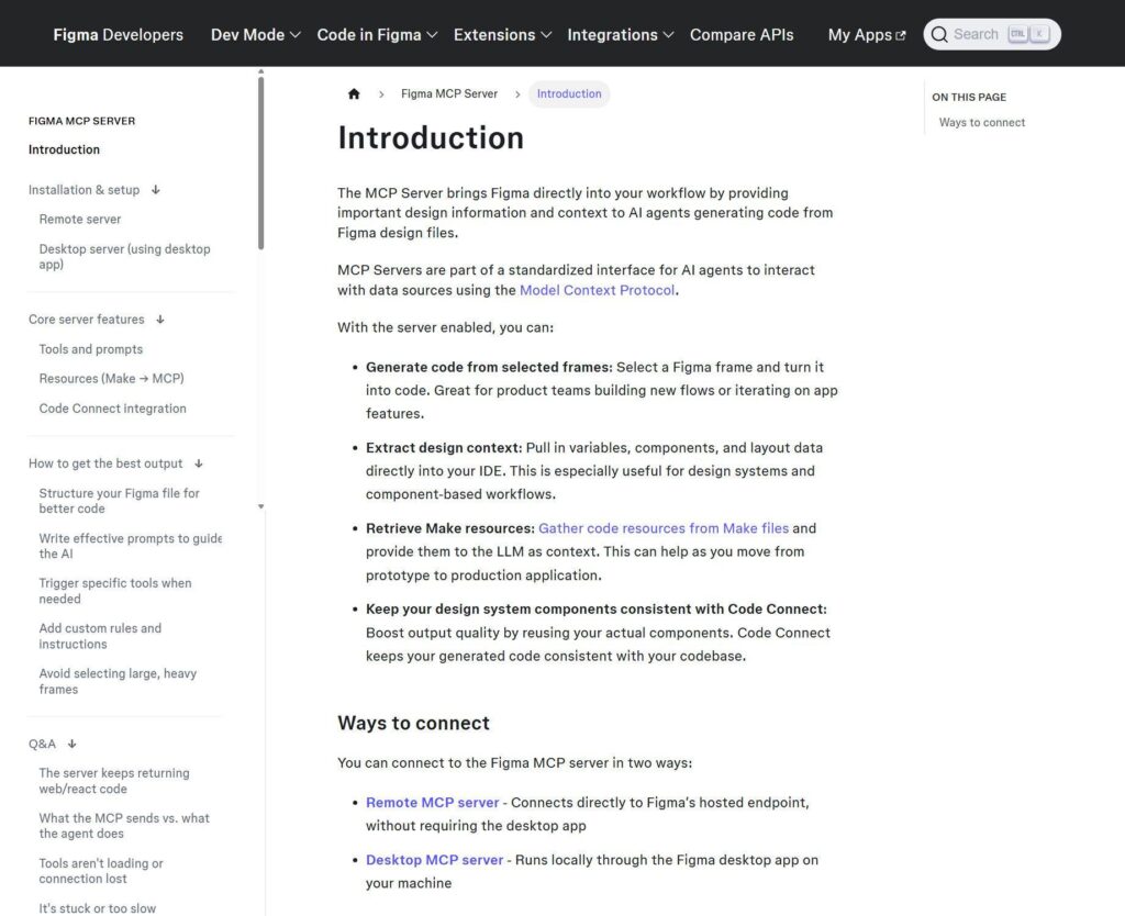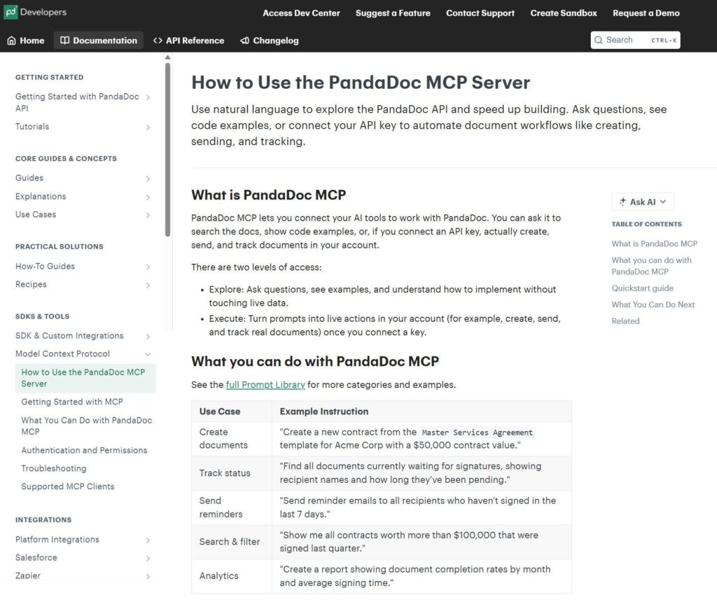 5 Examples of Excellent MCP Server Documentation Posted in MarketingStrategy Janet Wagner January 6, 2026 Model Context Protocol (MCP) was all the rage in the tech world in 2025 and will likely stay that way throughout 2026. MCP is changing how developers bridge the gap between AI applications and local or remote data. One of these bridges is the MCP server, which exposes capabilities to AI applications through tools, resources, and prompts. As developers are the primary users of MCP servers, companies need to think carefully about developer experience (DX) when releasing one. For most developers, that experience starts with the documentation. So today, we are outlining what makes for great MCP server documentation. We have highlighted five real-world examples of excellent MCP server documentation from the following companies: Figma, GitLab, PandaDoc, SmartBear, and Webflow. Components of Good MCP Server Documentation As more companies build and release MCP servers, patterns have emerged that are indicative of quality MCP server documentation: Main menu that is well-organized and easy to navigate. Prominent links to relevant pages and information. Clear instructions for MCP server installation and configuration. Tools organized into use-case-driven sections. Explanations of what the tools are and what they accomplish. Examples of good natural language prompts for guiding the AI. Troubleshooting or FAQ section covering common issues and fixes. It is critical for companies that offer an MCP server to provide documentation as outlined because it: Helps developers and AI applications better understand what the server does and the tools it offers. Makes it easier for developers to configure the server and connect to the AI, preventing frustration that could lead them to look for well-documented alternatives from competitors. Shows the possibilities the MCP server offers through use cases and capabilities, encouraging developers to innovate when building AI applications. Improves the developer experience, which in turn can lead to increased adoption of the server and a growing community around it and the platform. Now, let’s look at some examples of excellent MCP server documentation. We chose these because they go well beyond a GitHub README, and most of them meet all the criteria outlined above. Figma MCP Server Documentation Website | MCP documentation Figma is a collaborative design platform that enables teams to work together on brainstorming, planning, designing, and developing various digital projects. The company announced the beta release of its official local MCP server in June 2025. The server allows developers to access context from Figma and bring it into AI tools such as Cursor, Windsurf, and Claude Code. For example, an AI agent could generate code from a selected Figma frame, or an IDE could pull context from designs in Figma. What We Like About the Documentation Figma has created documentation with a simple design that is easy to navigate. Everything you need is listed on the main navigation menu on the left. One of the best parts of the documentation is the “tools and prompts” section. It clearly explains the different tools the Figma MCP server provides, along with some examples of suggested prompts. The Q&A on the left menu is quite helpful for developers who have run into issues when using the server. Another great feature is the “how to get the best output” section in the navigation menu, which gives developers a better chance of success. Conclusion: Figma’s documentation gives developers a big head start when working with the MCP server. GitLab MCP Server Documentation Website | MCP documentation GitLab is a comprehensive DevSecOps platform that allows teams to complete numerous tasks in various categories. These categories include source code management, continuous integration, security, and continuous delivery. The company announced support for Model Context Protocol in September 2025, which includes an MCP server that enables AI tools to securely connect to a GitLab instance. The server is available through the GitLab Duo add-on (Core, Pro, or Enterprise), and it currently supports these use cases: issues, merge requests, pipelines, and server info. What We Like About the Documentation GitLab’s MCP server documentation is easy to navigate and provides clear and detailed installation instructions for a number of AI tools, including Cursor, Claude Code, and Gemini Code Assist. There is a troubleshooting section that explains several issues that could occur while working with the server. It would be helpful to have more common (and not-so-common) issues covered in this section. The best part of GitLab’s MCP server documentation is the “Server Tools” section, which outlines all the tools available along with natural language examples. The tools are not organized into use-case-driven sections, though, which could be a nice structural change to improve navigation. Conclusion: GitLab’s documentation gets the job done. PandaDoc MCP Server Documentation Website | MCP documentation PandaDoc is a document automation software platform that you can use for a variety of paperless business use cases, such as obtaining eSignatures and managing contracts. The company announced the release of its new MCP server in September 2025. It allows developers to build AI agents that drive complete agreement flows. For example, an AI agent could leverage PandaDoc through the MCP server to instantly assemble contracts or handle dynamic processes like compliance checks. What We Like About the Documentation The PandaDoc documentation is designed simply, with straightforward navigation that makes it easy to find the information you need to get the server up and running. One standout feature of the documentation is its prompt library. It’s chock full of prompt examples for many use cases — create documents, track status, search and filter, and the list goes on. There is a se